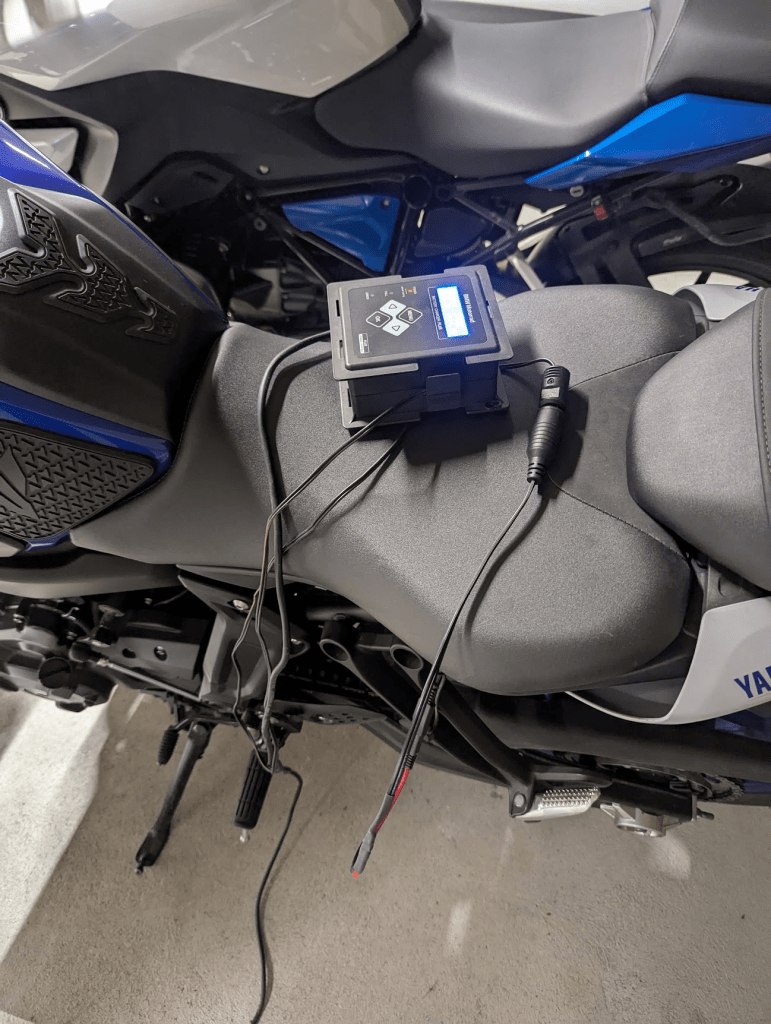 I happen to have a Yamaha MT-07, whose battery has seen better days. As a direct consequence of this, starting the bike after a few weeks of sitting in garage is pretty challenging. Unmounting the battery is doable, but requires ~15 minutes of wrenching, which is not ideal for using the bike opportunistically (and has a very low WAF – Wife Acceptance Factor).